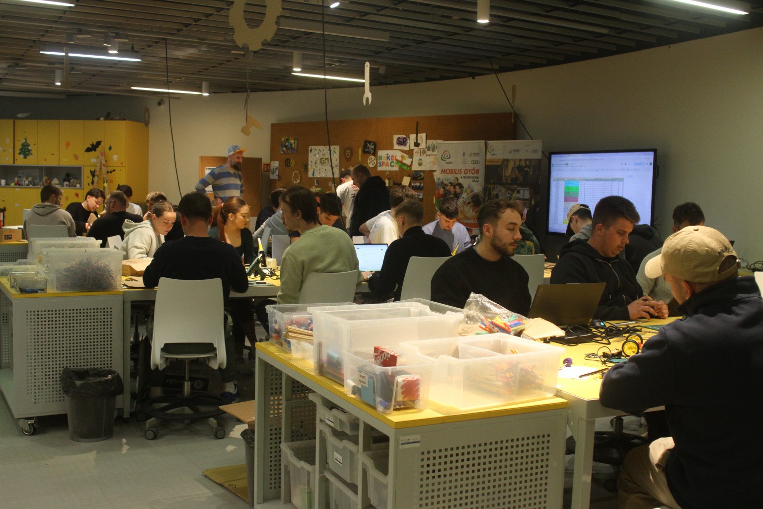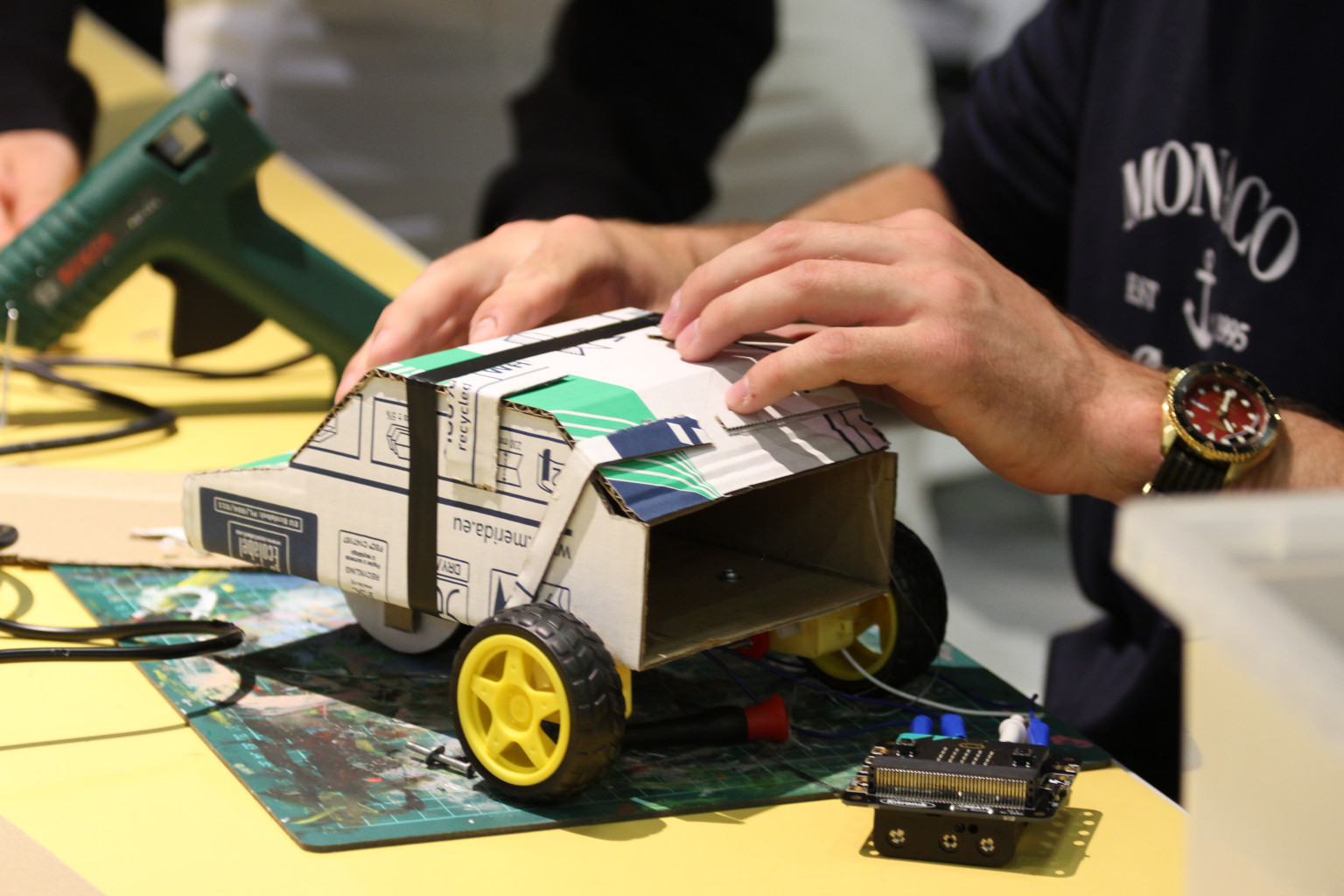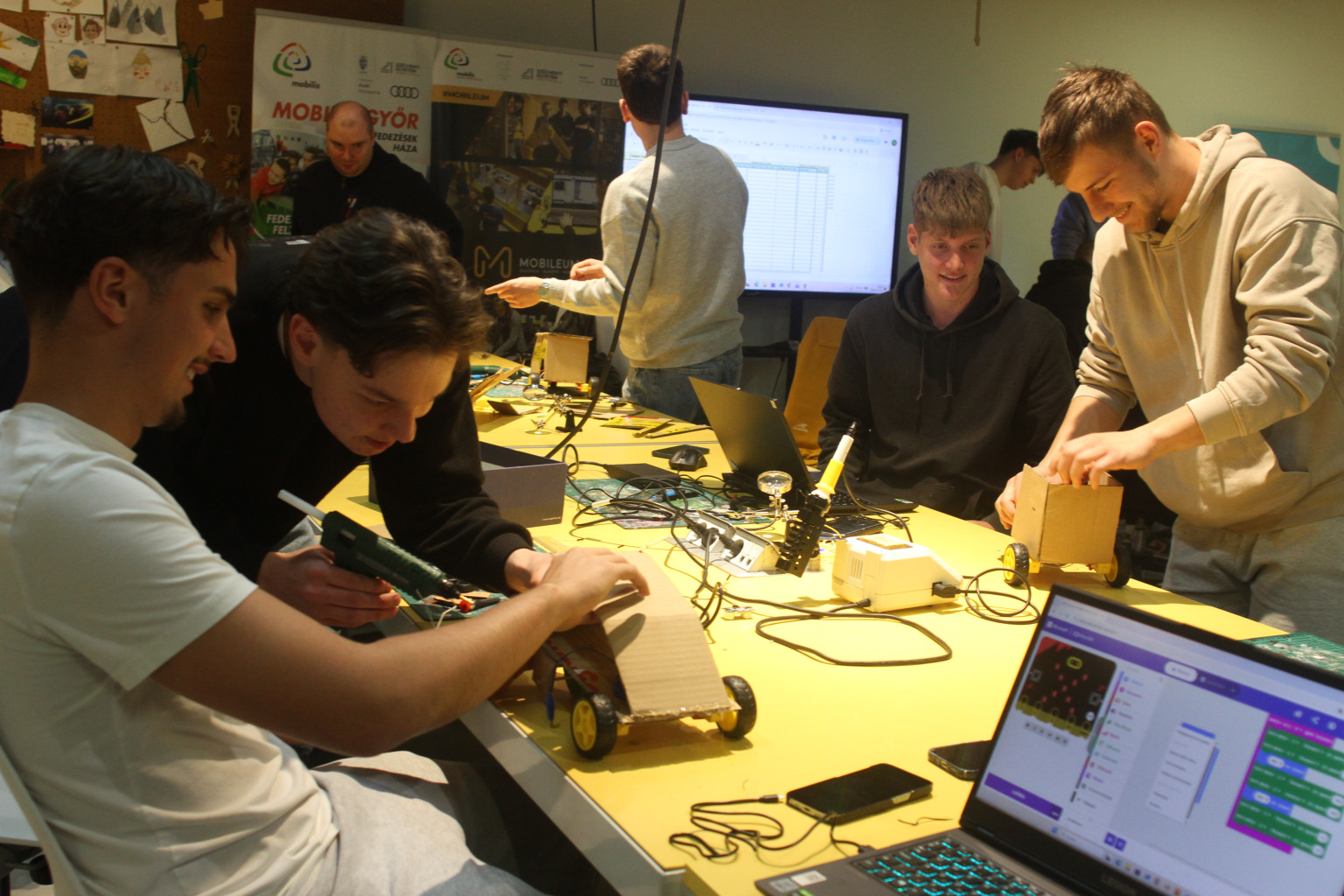 A második rész pedig gyakorlati: idén a diákok kaptak eszközöket (szenzorokat, motort, kábeleket, kerekeket, micro:bitet, motorvezérlőt…), amelyekből építeniük kellett egy működőképes járművet.