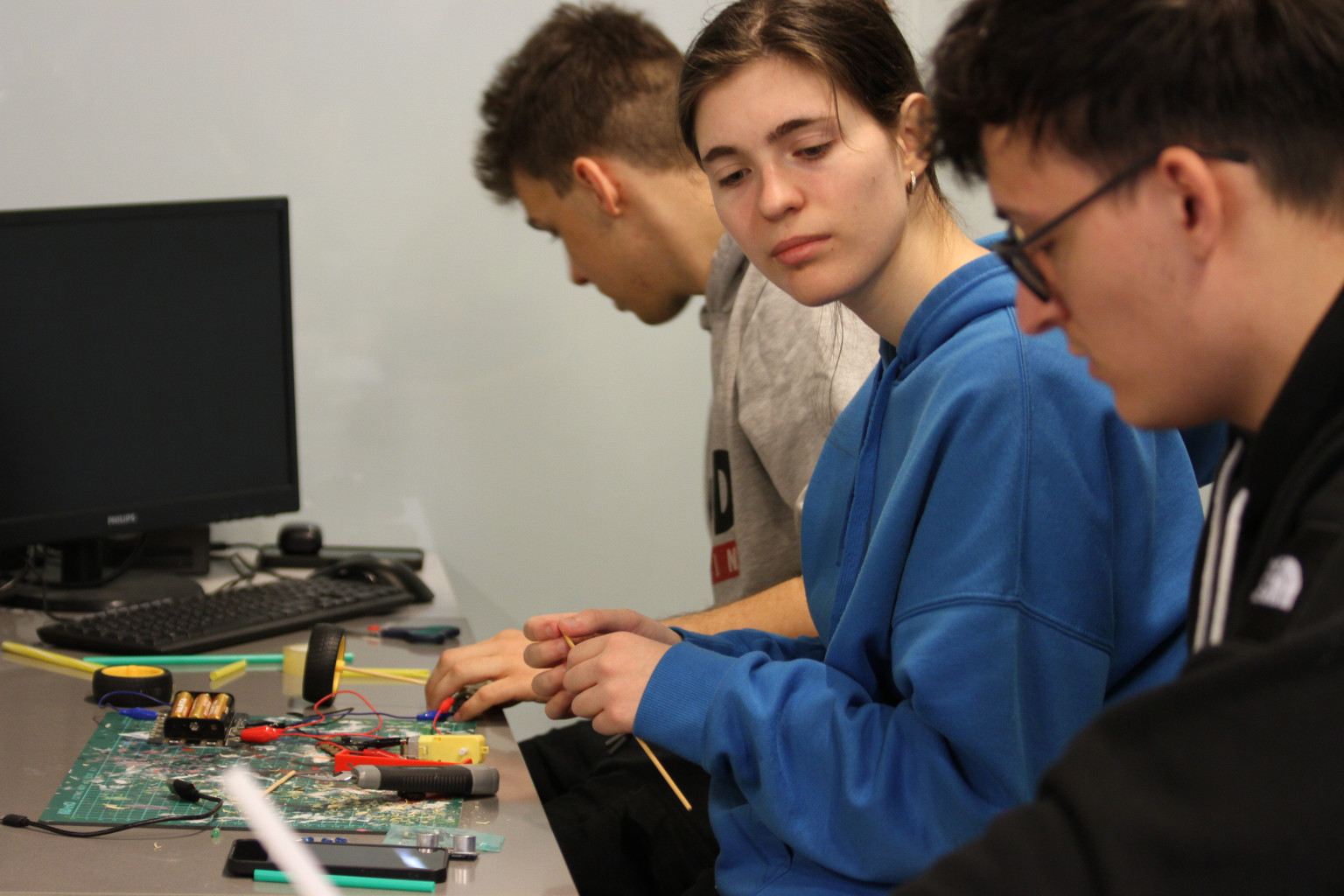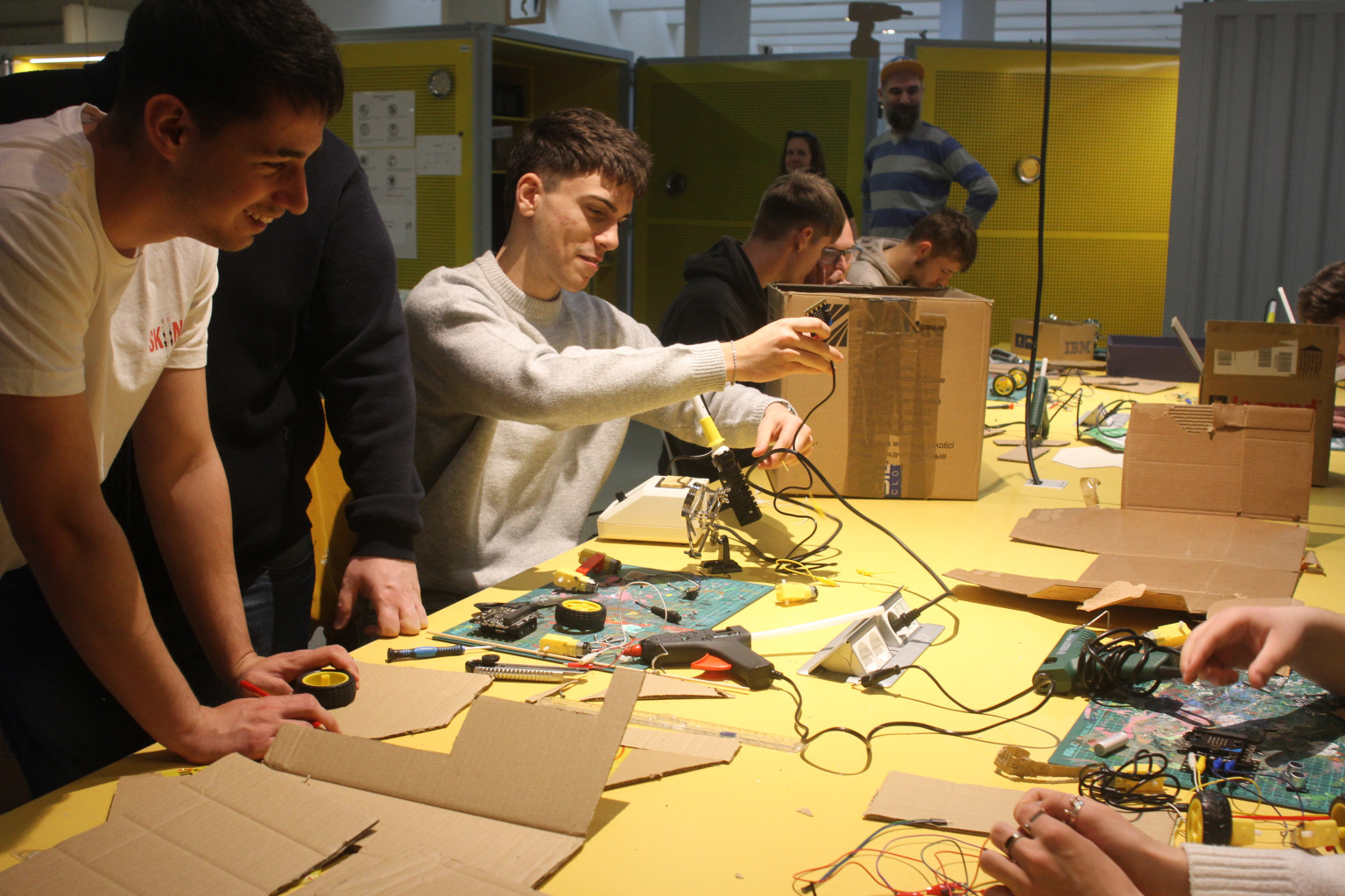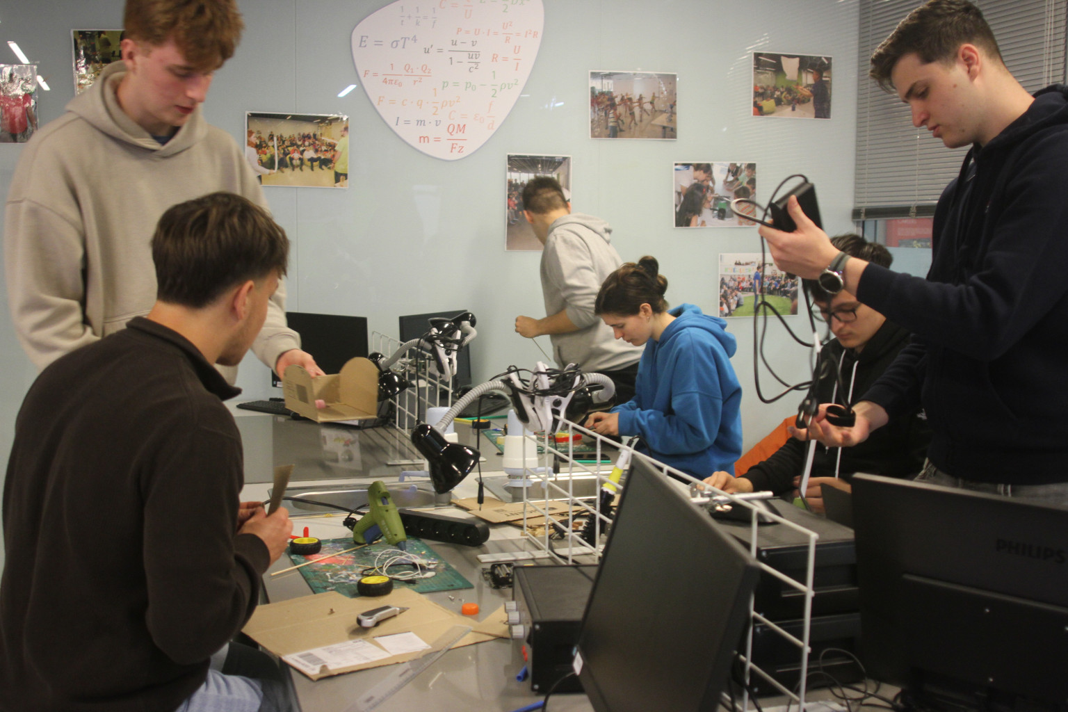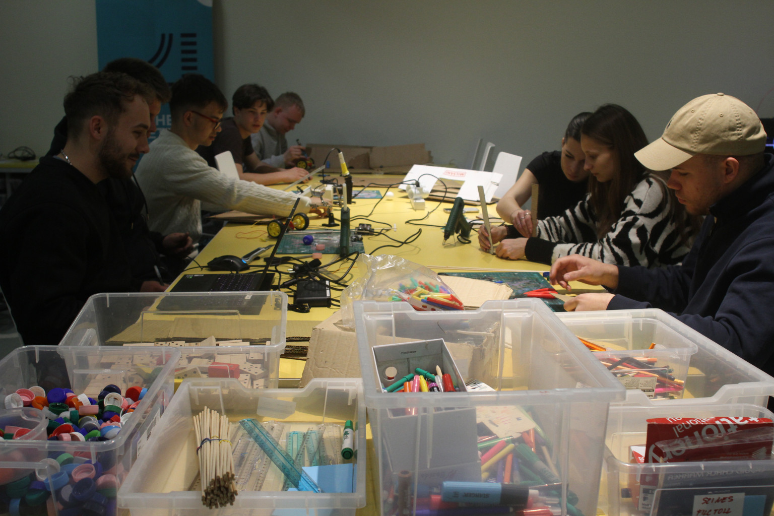 A második rész pedig gyakorlati: idén a diákok kaptak eszközöket (szenzorokat, motort, kábeleket, kerekeket, micro:bitet, motorvezérlőt…), amelyekből építeniük kellett egy működőképes járművet.