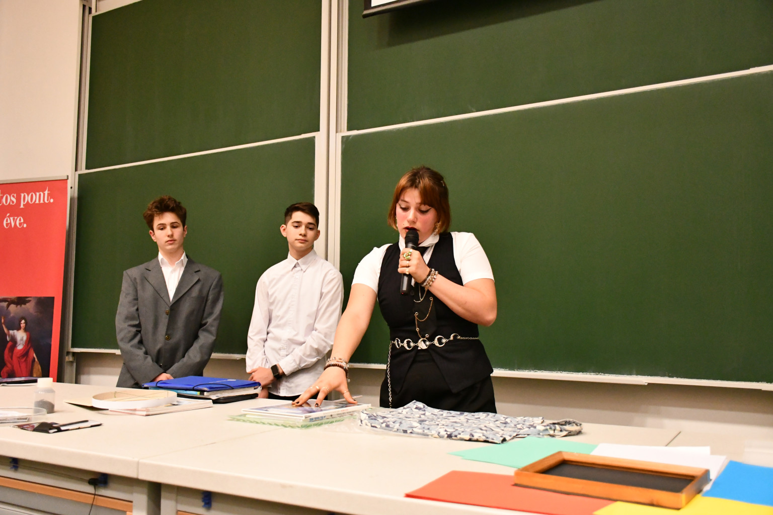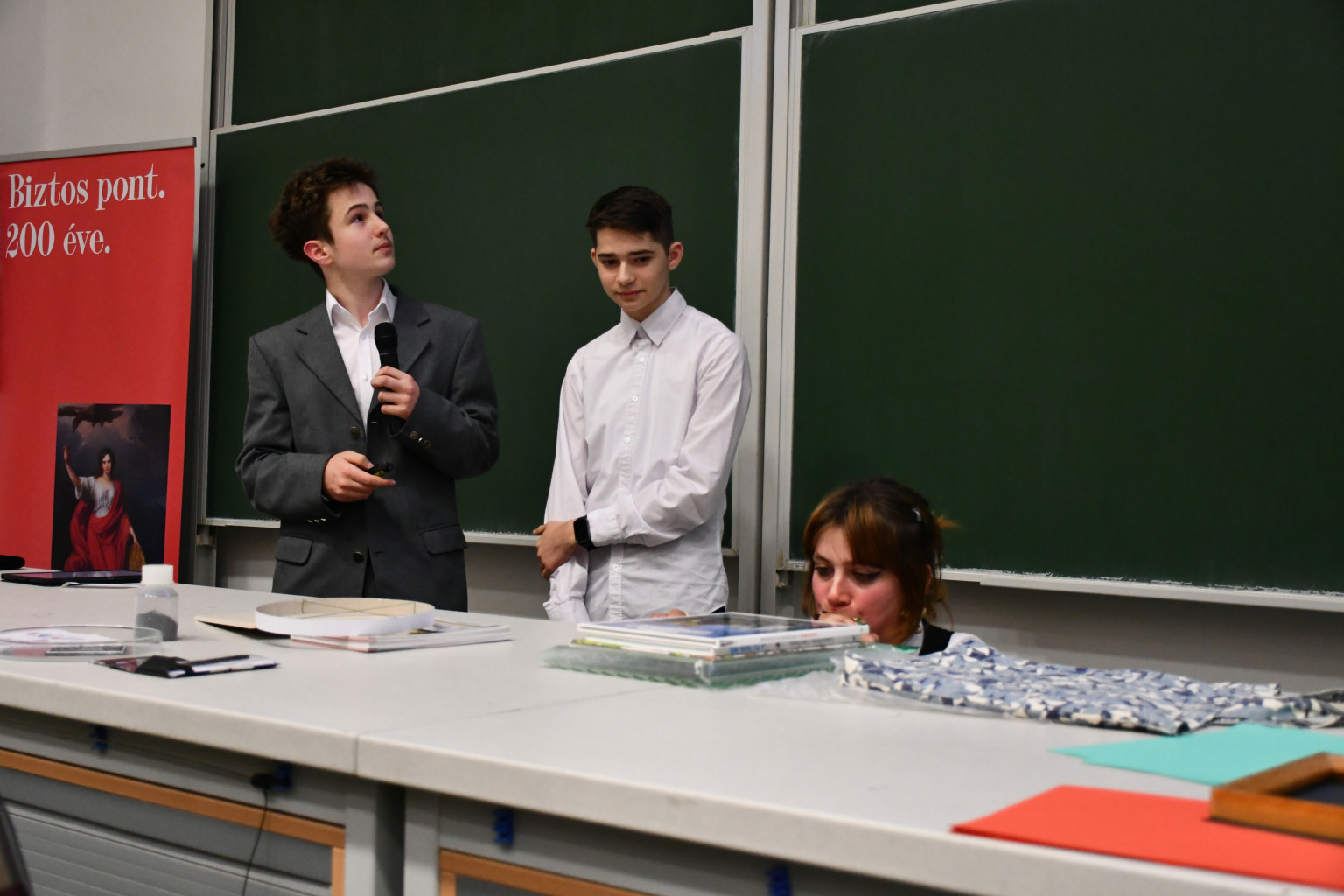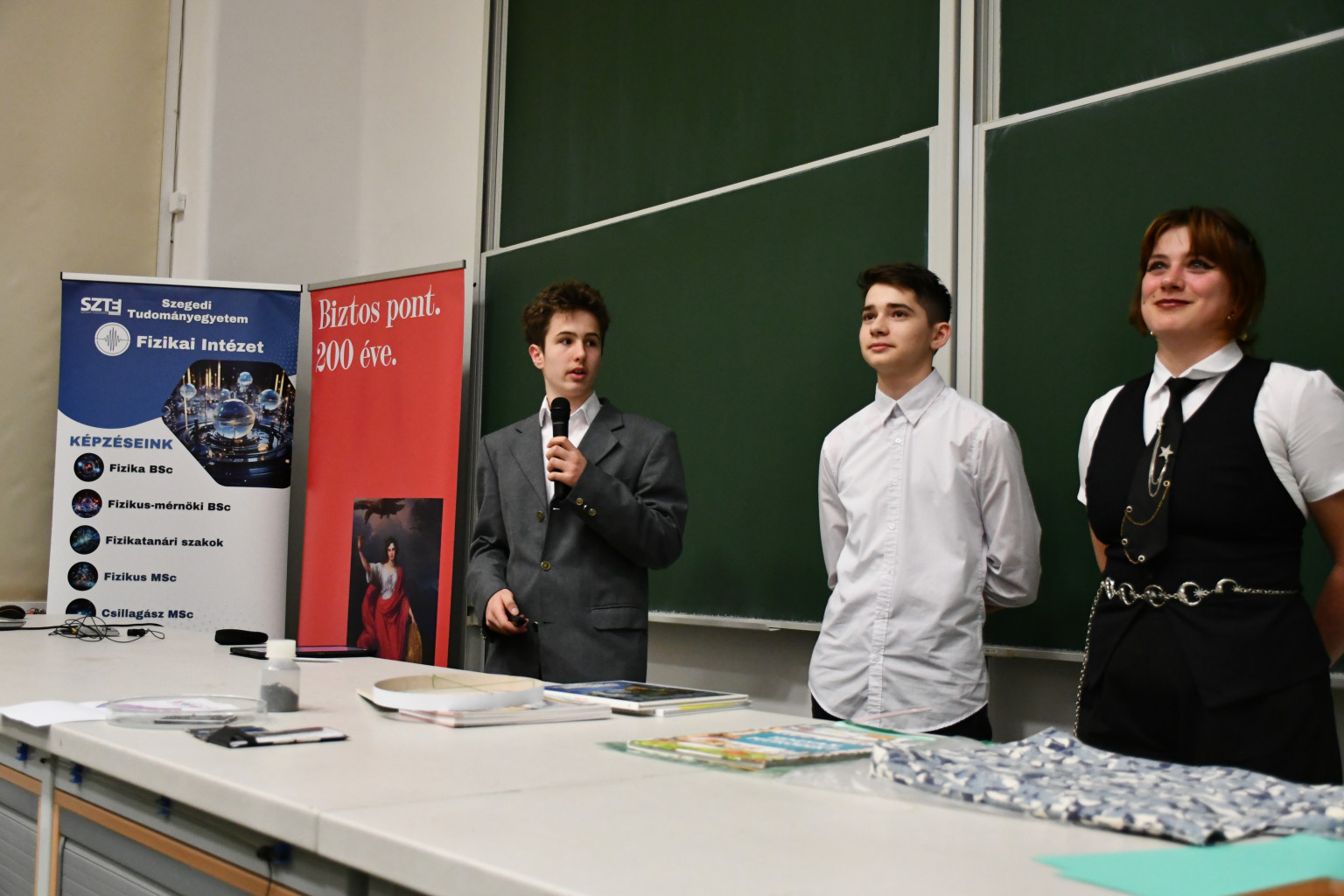 A második helyezést elért csapatba tartozott Környei Gréta diákakadémistánk a Czuczor Gergely Bencés Gimnáziumból, akik nejlonzacskókba fújt levegővel emeltek meg könyveket: ezzel határozták meg egy ember tüdőkapacitását.
