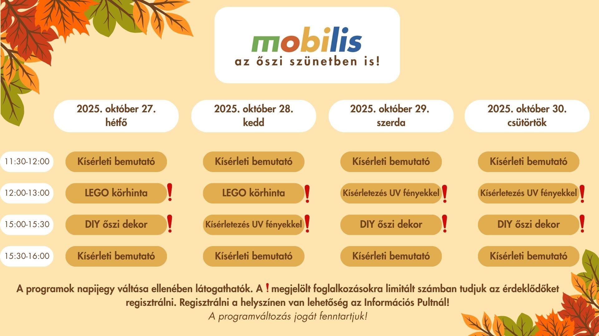A Mobilis Interaktív Élményközpontban az őszi szünetben is várjuk a látógatókat. Őszi tematikájú barkácsoláson vennétek részt, LEGO-t programoznátok vagy kísérleteznétek az őszi szünetben? Akkor a Mobilisben a helyetek!